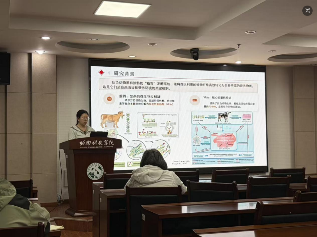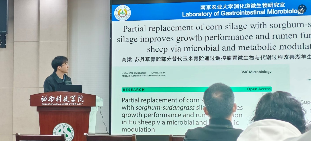硕士研究生乔枫汇报了《Partial replacement of corn silage with sorghum-sudangrass silage improves growth performance and rumen function in Hu sheep via microbial and metabolic modulation》-《高粱-苏丹草青贮部分替代玉米青贮通过调控瘤胃微生物与代谢过程改善湖羊生长性能及瘤胃功能》。