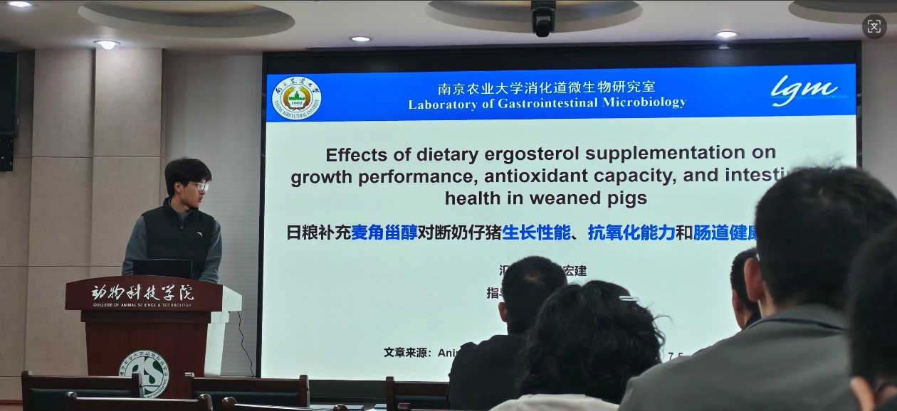 硕士研究生邢宏建汇报的文献是《Effects of dietary ergosterol supplementation on growth performance, antioxidant capacity, and intestinal health in weaned pigs》-《日粮补充麦角甾醇对断奶仔猪生长性能、抗氧化能力和肠道健康的影响》。
