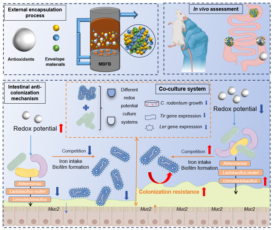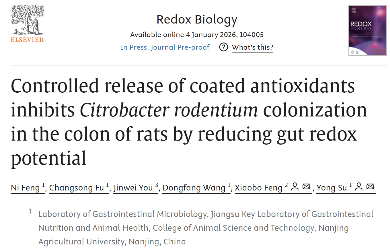 本研究评估了未包被抗氧化剂与包被抗氧化剂对动物肠道氧化还原电位及病原菌定植的影响,并阐明了抗氧化剂结肠靶向调控微生物定植的机制,为靶向调控肠道氧化还原电位的抗病原菌定植新策略提供了理论基础,并为开发维持肠道健康的肠内微环境调节剂提供了重要参考。